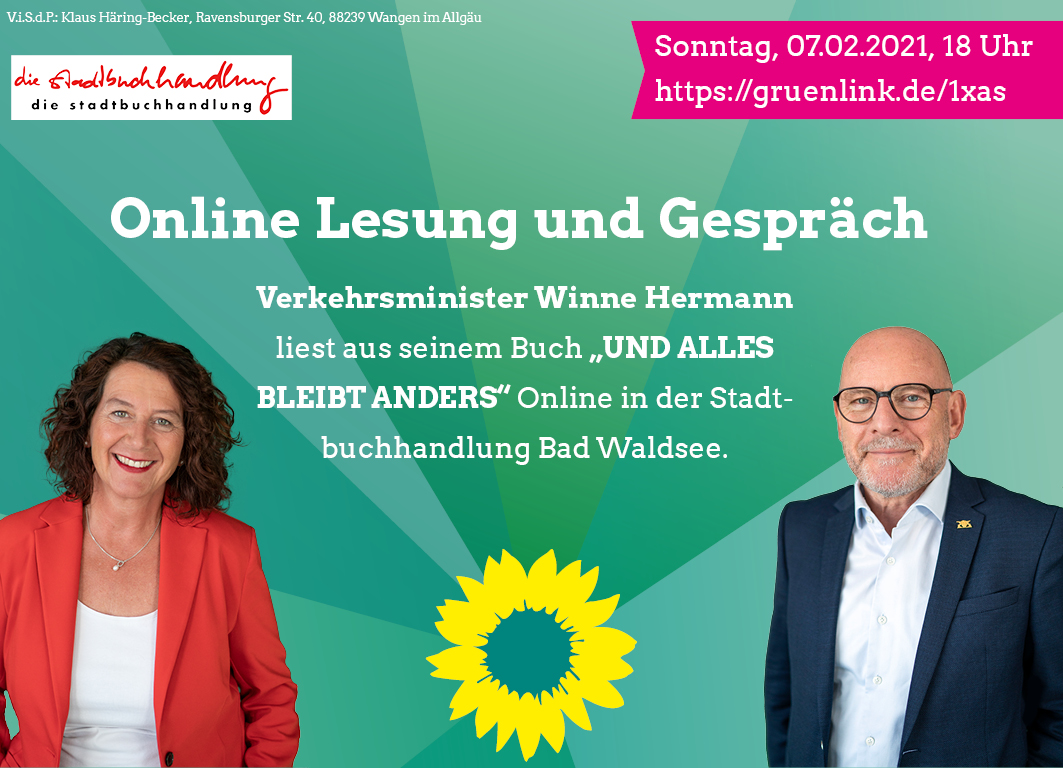 Gastgeberin der Online-Lesung ist Susanne Lorinser, Inhaberin der Stadtbuchhandlung Bad Waldsee. Dort führt Petra Krebs durch den Abend, Winne Hermann wird online zugeschaltet. Beginn ist um 18 Uhr am Sonntag, 7. Februar 2021. Einwahl-Link: https://gruenlink.de/1xas