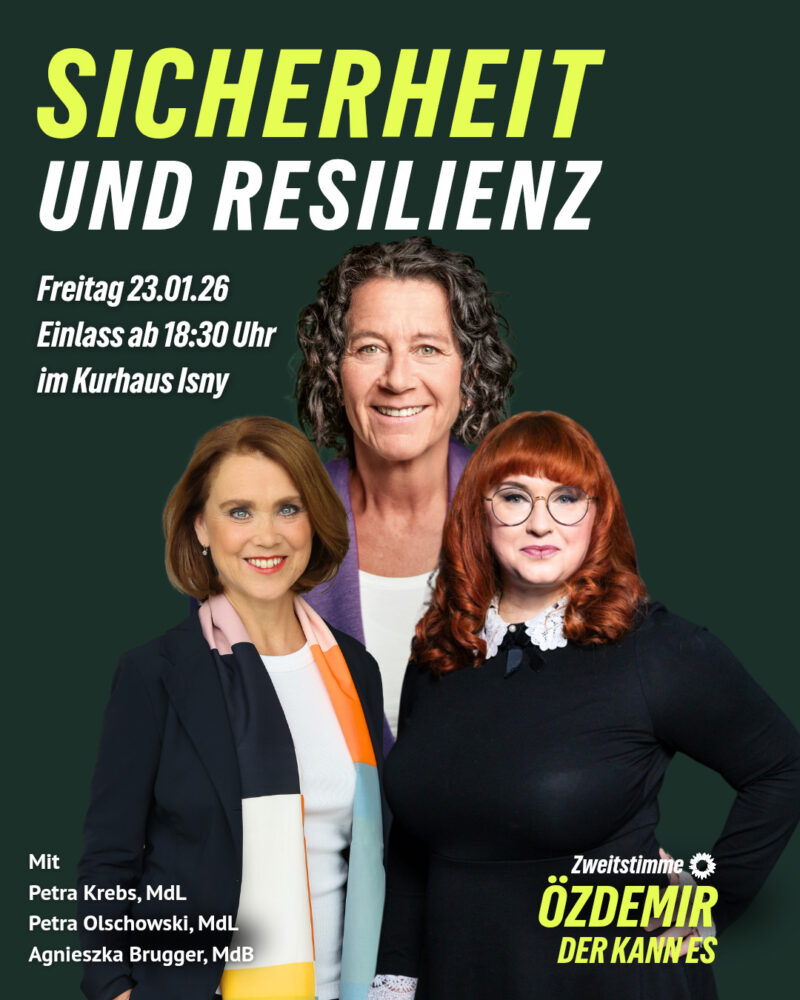 Zusammen mit der Landtagsabgeordneten Petra Krebs diskutieren Agnieszka Brugger, stellvertretende Fraktionsvorsitzende von Bündnis 90/Die Grünen im Bundestag, und Wissenschaftsexpertin Petra Olschowski MdL am Freitag, den 23. Januar 2026 um 19.00 Uhr im Kurhaus am Park in Isny über das Thema Sicherheit und Resilienz.